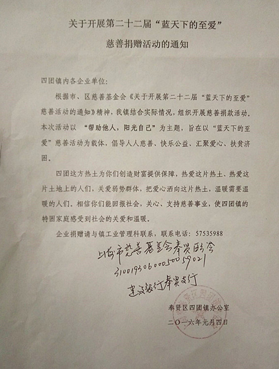 眾幸股份的下屬公司上海尊島防護(hù)科技有限公司響應(yīng)四團(tuán)鎮(zhèn)人民政府的號(hào)召,積極參與公益事業(yè),為第二十二屆“藍(lán)天下的至愛”慈善活動(dòng)添磚加瓦,貢獻(xiàn)自己的綿薄之力。